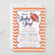 Marinho moderno e chá de fraldas de esporte ousado e brilhante, cor de laranja, com um futebol bonito. Nossa, é um convite para o futebol de um menino bebê é colocado em um plano de fundo zigzag chevron fofo e tem um retorno para um toque especial extra. Perfeito para um pequeno chá de fraldas desportivo