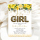 Convites de chá de bebê bonitos com um simples fundo branco, bonito brilho, elegantes florais amarelos de aquarela, o ditado "é uma menina" em um roteiro e letra de balão de impressão leopardo, e um modelo de celebração de bebês que é fácil de personalizar.