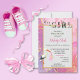 O cartão de convite para Chás de fraldas é totalmente personalizável. Lindas flores cor-de-rosa incorporam as letras de um fundo de mármore rosa-claro.