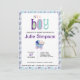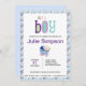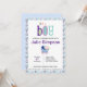 Convite para um bebê com um adorável bebê numa bolinhas azul e carruagem de bebê stripe.