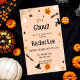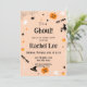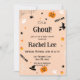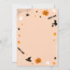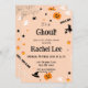 Um simples e sofisticado convite para chás de fraldas de Halloween para meninas. Fantasmas bonitos, abóboras, morcegos, doces, chapéus de bruxas, esqueletos, e espiar uma tipografia surround assustadora sobre um fundo de pêssego. Perfeito para o outono e chás de fraldas de Halloween com esquema de cor laranja, roxo, preto e branco.