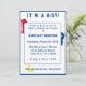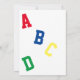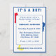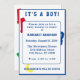 Design frente apresenta um título personalizável, "É um menino!" em letras azuis brilhantes contra um fundo branco. Seu texto é apresentado em letras azuis brilhantes contra um fundo branco. A imagem de fundo é das letras "ABC" em cores primárias. Uma borda azul é exibida ao redor de design. Todo texto é personalizável. O design traseiro apresenta "ABCD" em cores brilhantes como fundo. Projetado para coordenar com a "Coleção de Chás de fraldas ABC".