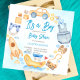 É um garoto, brinquedos de roupas, chá de fraldas de convite para modelo. Brinquedos bonitos, roupas, pacificador para um chá de fraldas de bebê.
