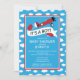 É um convite para chás de fraldas de menino que inclui um avião com faixa colocada sobre fundo azul com nuvens brancas.