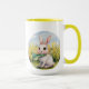 Esta é uma caneca com um coelho fofo sentado sobre ela. Tenha um dia feliz