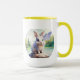 Esta é uma caneca com um coelho fofo sentado sobre ela. Tenha um dia feliz
