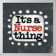 "É uma Enfermeira Coisa" é um design de texto fofo em cinzas com texto preto e vermelho, junto com uma forma de sotaque branco e pontos brancos texturizados ao seu redor.