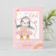 "É uma garota" Bem-vindo ao cartão de anúncio do Mundo para filha ou neta. O cartão tem um pinguim adorável e um arco-íris na frente e detalhes de nascimento nas costas.