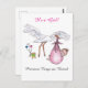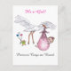 Um maravilhoso cartão postal para futuras mães, permitindo que todos saibam que 'É uma Menina!'. Faz um presente fabuloso, especialmente em um chá de bebê. Uma grande cegonha branca está trazendo seu pacote de alegria enquanto um pequeno ursinho está flutuando em balões em forma de coração para ela.