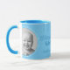 Uma caneca de celebração de um bebê azul, com um coala bonito, sentada em uma caixa de presentes e pintura de aquarela de balão. Personalize com o nome e a data de nascimento dos seus bebês e duas fotos especiais. Um presente comemorativo de excelente para um bebê recém-nascido. Arte original e design por Sarah Trett para www.mylittleeden.com no zazzle.