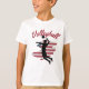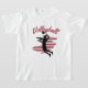 Esta camiseta apresenta uma silhueta de um jogador de vôlei em ação contra um pano de fundo de uma bandeira americana, com a palavra "voleibol" acima.
