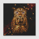 Eclipse Majestade, mostre um leopardo com pele de ouro brilhante e manchas distintas, colocado sobre um fundo escuro. Os olhos do leopardo estão iluminados em roxo brilhante, criando um efeito marcante e místico. Os arredores escuros são acentuados por luzes espalhadas e quentes, dando à cena uma atmosfera dramática quase de outro mundo.