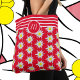 Um saco vermelho com um padrão misto de flores de rabisco e quatro linhas brancas horizontais no topo. Personalize-o com uma inicial. Este saco também está disponível em ciano, verde-claro e preto. © ArianeC Ilustrações — Todos os direitos reservados