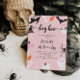 Um cartão de convite de aniversário de menina do tema do Dia das Bruxas, bonito, com ilustração de um fantasma, gato preto, aranha, morcego, doces e abóboras. O texto diz "ei boo".