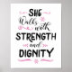 Design de tipografia com dois roteiros de Pincel moderno, com palavras do Proverbs 31, escritura Bíblia a preto, "Ela caminha com Força e Dignidade." A design inclui enfeites e sotaques cor-de-rosa e é perfeita para a mulher "provérbios 31" em sua vida!