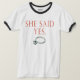 Camisetas e presentes de noivado perfeitos para a sua despedida de solteiro, festa de noivado ou fim de semana. Roupa e presentes de noivos com fotografia de um anel de diamante e texto que permitem que todos saibam que ela disse sim quando você fez a pergunta. Camisas de noivado, presentes e favores.