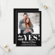 Ela disse sim! Informe a família e os amigos sobre suas notícias de excelente com este cartão de anúncio de noivado moderno. Apresenta tipografia na moda em branco sobre fundo preto. Facilmente personalizável com sua foto.