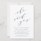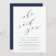 Simples e elegante festa de noivado apresenta "ela disse sim" em letras de caligrafia azul marinho chic. Personalize com seus detalhes de celebração de noivado abaixo. Convites de festa de noivado reverso para marinho sólido.
