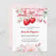 Um fundo branco elegante, decorado com um arco cor-de-rosa com cerejas e flores cor-de-rosa. Personalize e adicione um nome e detalhes da parte. Texto: Ela é a Cherry no topo de trás: fundo rosa macio. 1 folha = 1 convite impresso de borda a borda.