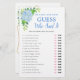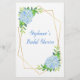 Este jogo de chá de panela é um jogo que ele disse, ela disse adivinhem quem disse. Apresenta flores azuis de hidrangea, folhagem e design geométrica dourada falsa. Personalize a parte de trás do cartão com o nome da noiva. Produtos correspondentes disponíveis.