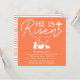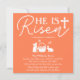 Envie este convite de Páscoa coral para sua família e amigos para que eles saibam que você irá sediar uma celebração da Páscoa. O design é elegantemente simples, apresentando as palavras "ELE RESSUSCITOU" no topo, juntamente com uma encantadora cena de Páscoa que inclui as silhuetas de coelhos, borboletas e uma cesta de Páscoa. Todos esses elementos estão definidos contra um fundo coral, enquanto o restante do texto, incluindo os detalhes do evento, é em branco. Você pode personalizar as informações de acordo com as suas necessidades. Então, faça seu pedido hoje mesmo!
