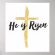 Celebrar a ressurreição de Jesus com este elegante design de tipografia com escrita de pincel com palavras a preto, que declara, "Ele é Risen." O fundo é uma cruz desenhada à mão no estilo da folha de ouro (digitalmente fundida). Referência bíblica de Matthew 28:6.