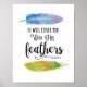 Design de tipografia com caligrafia e glifos com palavras a preto, "Ele vai te cobrir com suas penas." O design é centrado entre duas ilustrações de pena de aquarela (azul e verde) no centro superior e inferior do design. Escritura é do Salm 91:4.