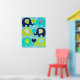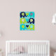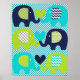 A poster de viveiro do Elephant Love apresenta seis elefantes em azul marinho, azul lacrimogêneo e verde limão com faixa de fevron impressa, flores e orelhas pontilhadas em um fundo de faixa diagonal azul e branca!