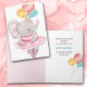 Aqui está um cartão de aniversário fofo para qualquer criança! A frente apresenta um elefante de cinza vestido com um tutu cor-de-rosa e pantufas de balé. Ela segura uma corda com três balões brilhantemente coloridos. O dentro da placa tem campos de texto em cinza e venda para que você personalize ou saia como está. Também tem uma segunda imagem dos balões.