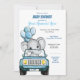 Chá de fraldas com Elefante Bebê no carro azul e balões para uma celebração de chá de fraldas.