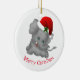Enfeites de natal mostrado em forma redonda com fundo branco e vermelho e um impressão de elefante papai noel de feriado bonito. Personalize este item ou comprar como está.