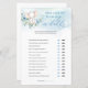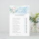 Este incrível design de estilo boho para Mamãe ou Papai - jogo engraçado de Baby Shower de menino apresenta elefante bebê pequeno fofo pintado à mão com aquarela sentado sobre a coroa de eucalipto como balanço decorado com flores azuis empoeiradas e combinadas com caligrafia moderna.