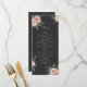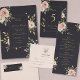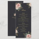 A luxurious wedding menu card featuring a deep black background adorned with delicate blush roses and refined gold accents. The graceful floral arrangement and elegant typography create a timeless and sophisticated reception table setting.
