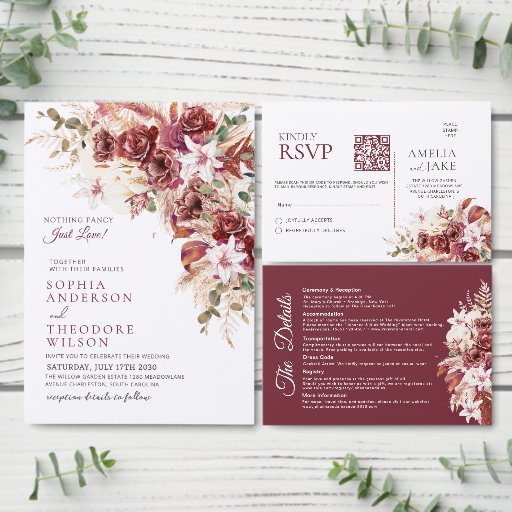 Complete your stationery suite with this romantic RSVP card from the Nothing Fancy, Just Love collection. Designed with burgundy and blush watercolor florals, soft greenery, and refined modern typography, this card pairs effortlessly with your matching invitation and Save the Date designs.