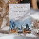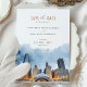 Anuncie o seu próximo casamento com este convite da "Salve-a-Data" com a estonteante linha do horizonte de Chicago, Illinois. A design mostra uma ilustração com uma aquarela impressionante da paisagem icônica de Chicago, incluindo a famosa escultura Cloud Gate, também conhecida como "O Bean". O texto é apresentado elegantemente numa mistura de fontes modernas de serifa e roteiro, com cores como ouro mudado, verde-oliva e terra quente, acrescentando um toque de sofisticação urbana. Ideal para casais planejando um casamento na cidade na moda, este convite captura lindamente a essência da atmosfera vibrante de Chicago.