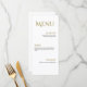 The bold “Menu” heading creates a striking focal point, while clearly defined sections for Starter, Main, and Dessert keep the layout clean and effortlessly readable. The combination of graceful lettering and generous white space adds an understated luxury that complements formal, black-tie, and contemporary wedding styles.