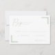 This elegant wedding RSVP card features a minimalist design with ample negative space, creating a clean and sophisticated look. The soft pastel green color palette adds a gentle touch, while the modern script font for "RSVP" exudes formality and grace. Decorative corner brackets provide subtle vintage charm, enhancing the overall understated elegance. Perfect for formal occasions, this card ensures clear communication with customizable fields for names, responses, and attendance numbers, making it both functional and stylish.