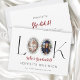 Celebrate your graduate's milestone with this elegant "Look Who's Graduated!" photo graduation announcement. This design features a striking 'L' and 'K' with customizable photo placeholders in ornate frames, perfect for showcasing your graduate's journey from baby to cap and gown. The heartwarming phrase "Who's Graduated!" is beautifully rendered in a stylish red script, above the graduate's name and school details. It's a sophisticated way to share your pride and joy with friends and family. Announce your special occasion with a touch of class and a personal touch, making this announcement a cherished keepsake.