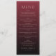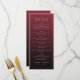 This elegant wedding menu features a vertical layout with a deep maroon background, creating a sophisticated and formal atmosphere. The design uses clean serif fonts for headings and sans-serif fonts for the body text, ensuring readability and modernity. Each section is well-spaced, enhancing the structured appearance, while gold accents add a touch of luxury. Perfect for high-end events, this template offers customizable placeholders for names and dates, making it ideal for personalizing your special day.