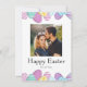 This Happy Easter card features a cheerful border of colorful patterned eggs in soft pastels - purples, pinks, yellows, and blues, each with its own playful design. Your photo sits right in the center, with a clean “Happy Easter” message below and space to add names like Kate and Thomas.