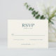 This elegant wedding RSVP card features a minimalist design with ample negative space, creating a clean and sophisticated look. The color palette includes a deep teal for the text against a soft cream background, offering a timeless contrast. The layout is centered, with bold serif typography for "RSVP" and clear sans-serif options for responses, ensuring readability and style. A touch of cursive script adds a personal feel, while checkboxes provide an easy way to indicate attendance. Perfect for formal events, this card balances simplicity with functionality, making it ideal for conveying your invitation with grace.