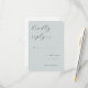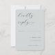 This wedding RSVP card features a minimalist design with a soft pastel teal background, creating an elegant and calming aesthetic. The layout is clean and spacious, with script-style typography for the phrase "kindly reply" paired with a serif font for clarity and sophistication. Customizable fields allow guests to indicate their attendance status and number of attendees, ensuring functionality without cluttering the refined appearance. The overall mood is graceful and subtle, making it ideal for formal occasions that require polite and organized communication.
