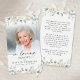 Keep the memory of a loved one close with this custom personalized prayer card featuring one cherished photo, the sentiment IN LOVING MEMORY, name and dates and an editable heartfelt remembrance message you can change to a meaningful poem, quote or bible verse and soft watercolor white flowers and greenery. It makes a meaningful keepsake to share at a funeral, memorial service, visitation, wake or Celebration of Life and offers comfort and a lasting tribute for family and friends. Its small and portable size of 3.5x2" (wallet-sized) makes it convenient for loved ones to carry it with them as a reminder of your loved one’s life and spirit. Personalization makes each card unique.