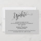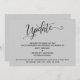 A distinção deste conjunto deve-se à fonte elaborada e giratória do script usada para frases de sotaque. Se precisar avisar seus hóspedes que seu casamento foi adiado, este cartão oferece uma opção elegante e simples. Nesta peça, a letra da caligrafia foi usada para criar um gráfico com a palavra "Atualizar". Use os campos modelo para adicionar seus detalhes pessoais e tornar este design seu. O plano de fundo pode ser alterado para qualquer cor que você preferir. Por favor, responda a quaisquer solicitações especiais ou personalize a assistência. 98 //