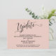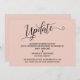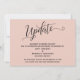 A distinção deste conjunto se deve à fonte de texto elaborada e circular utilizada para as frases de destaque. Caso precise informar aos seus convidados que o casamento foi cancelado, este cartão oferece uma opção elegante. Nesta peça, a fonte de caligrafia foi usada para criar um gráfico que representa a palavra "Atualização". Use os campos do modelo para adicionar seus detalhes pessoais e tornar este design único. O fundo pode ser alterado para qualquer cor de sua preferência. Por favor, entre em contato para qualquer solicitação especial ou para obter ajuda na personalização. // 98 //
