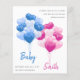 Um Convite de festas do gênero no orçamento. Em um fundo branco, muitos balões azuis e cor-de-rosa em forma de coração contêm texto tipográfico que lê Baby Your Surname (Seu Apelido de Bebê). Personalize adicionando os detalhes do evento à frente e atrás.