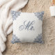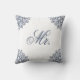 Esta elegante almofada branca e azul com a palavra Sr. em escrita é parte de produtos combinados para fazer um conjunto de duas almofadas para presente de recém-casados.