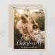 Cartão de Natal com fotos modernas, com uma design simples e mínima, com "Feliz Natal" em uma tipografia elegante sobre sua foto favorita cercada por uma borda bege claro-netural. A frente tem uma camada de gradiente para ajudar o texto a se destacar, que pode ser removido na ferramenta de edição de design, se preferir. O verso tem uma colagem de fotos com três fotos, junto com sua mensagem personalizada.