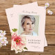 Este elegante cartão com fotos memorial apresenta um adorável fundo cor-de-rosa pincelado, uma bela ilustração vintage de uma peônia, uma fotografia quadrada, e uma simples mas elegante tipografia. Nas costas, o floral se repete e há espaço para escrever uma mensagem. Você pode remover o texto e adicionar outra foto, se desejar, basta clicar em "editar com a ferramenta design".