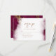 As bordas desta elegante e moderna placa RSVP apresentam um design vermelho de borda de cor-d-água entorpecido em imitação de mármore veinado com folha de ouro falsa, desaparecendo gradualmente no fundo branco. As letras "rsvp" aparecem em um guião de escrita manuscrita dourada. A data de resposta personalizável e o texto estão no texto de cinza de carvão. O verso apresenta um design de mármore vermelho e dourado correspondente.